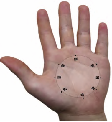 1.1 八卦穴位置 由于一般以八卦对应的手背为外八卦,因此